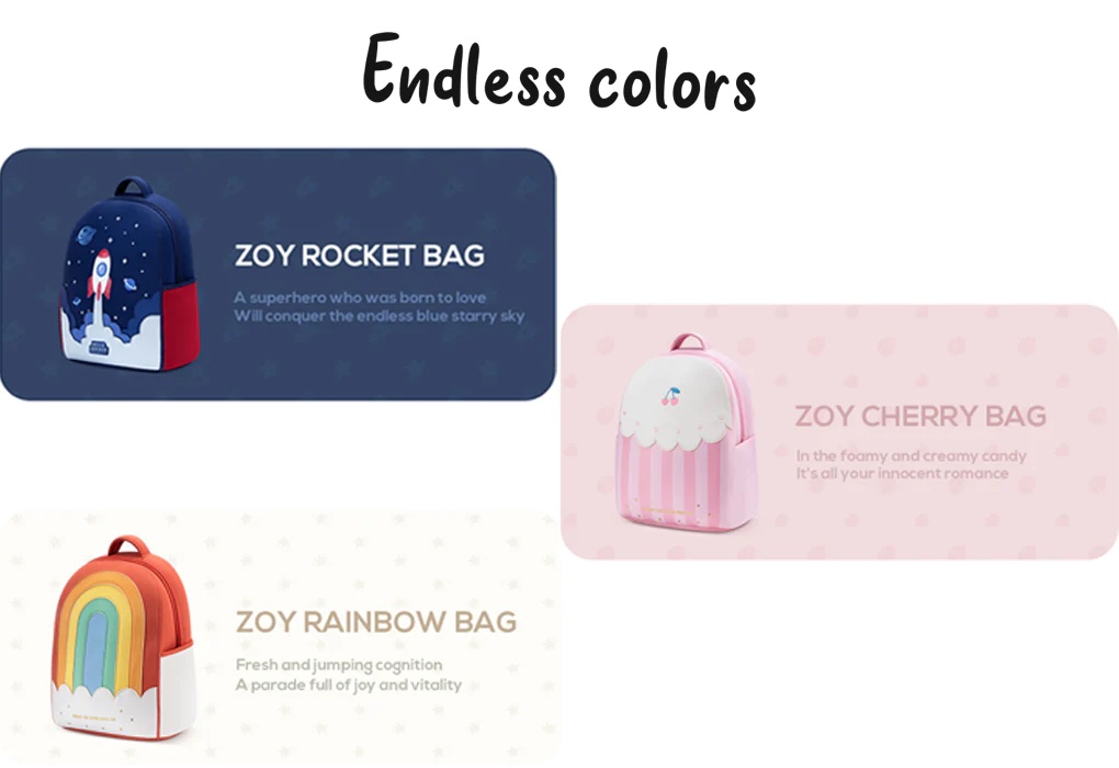 Balo trẻ em ZOY series thiết kế 3 màu sắc tươi sáng: cầu vồng, anh đào và tên lửa cực kỳ đáng yêu, dễ thương phù hợp với các bạn nhỏ, mẹ thoải mái lựa chọn cho bé yêu.