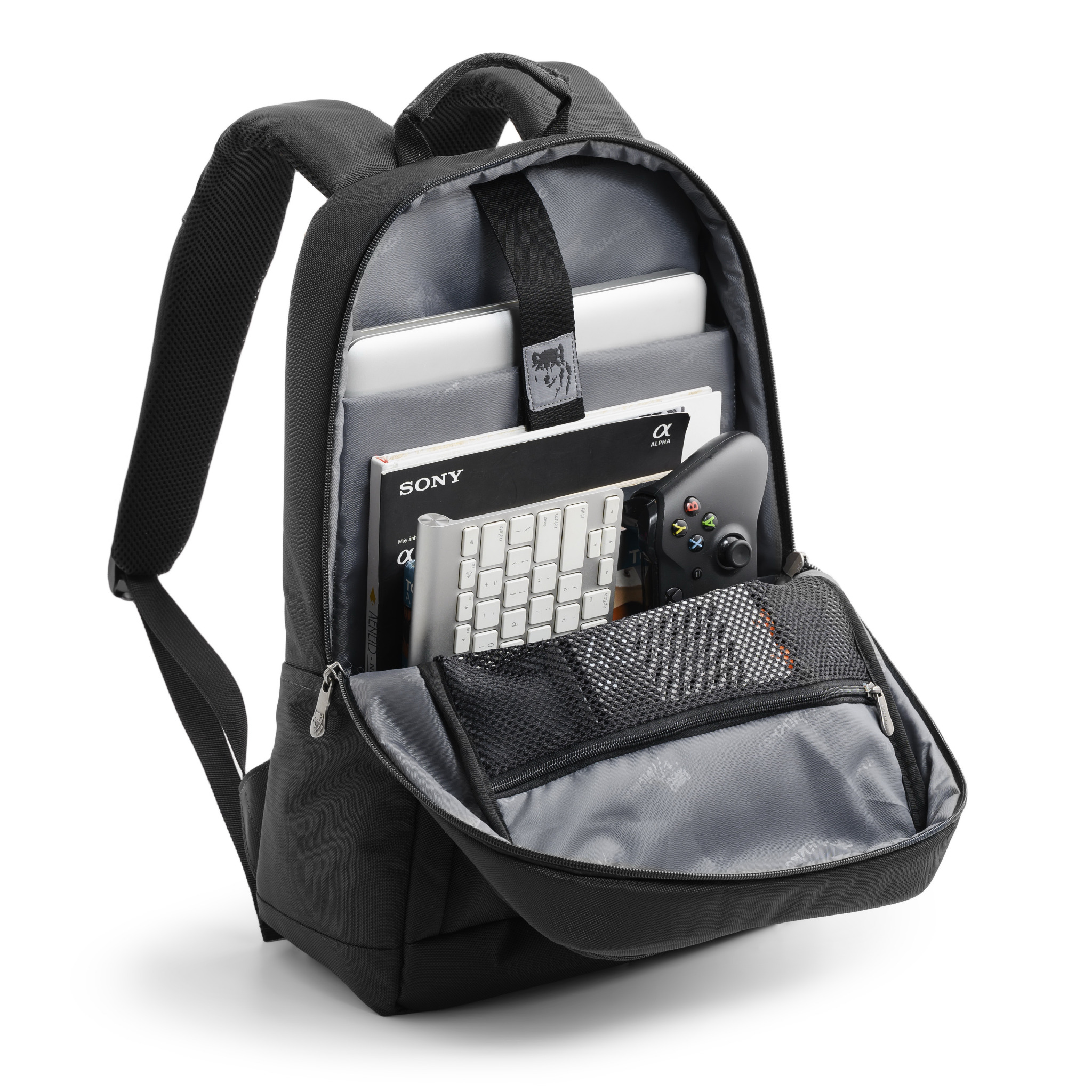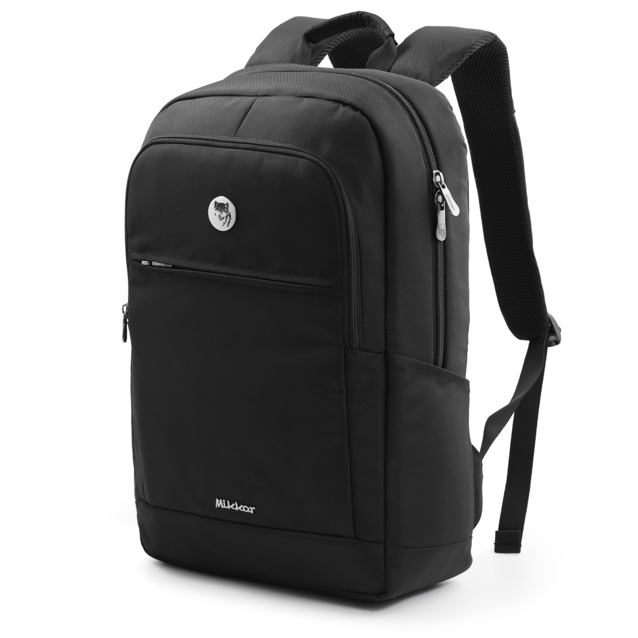 Mặt trước balo đính logo chú sói biểu tượng thương hiệu và logo hợp kim MIKKOR nổi bật.