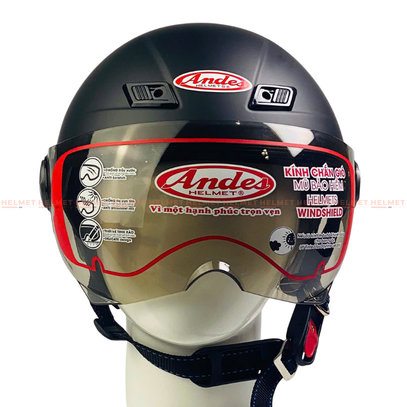 Mũ bảo hiểm nửa đầu có kính Andes 3S109K là sản phẩm có kích thước size vòng đầu được cải tiến lớn hơn nhưng vẫn đáp ứng đầy đủ các tiêu chí gọn – nhẹ – thoải mái phù hợp với khách hàng thường xuyên di chuyển trong thành phố.